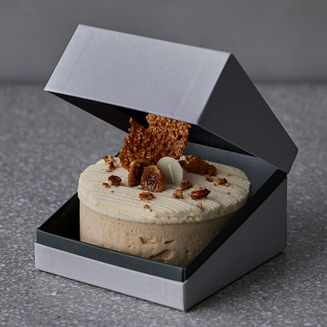二層のアイスチーズケーキ¥7,560税込(※送料込) - サクサクとしたチャイのシュトロイゼル生地に、ラム酒漬けした無花果入りカマンベールチーズのジェラートを重ね、マスカルポーネクリームをしぼりました。アクセントに白胡麻のヌガティーヌをおたのしみください。