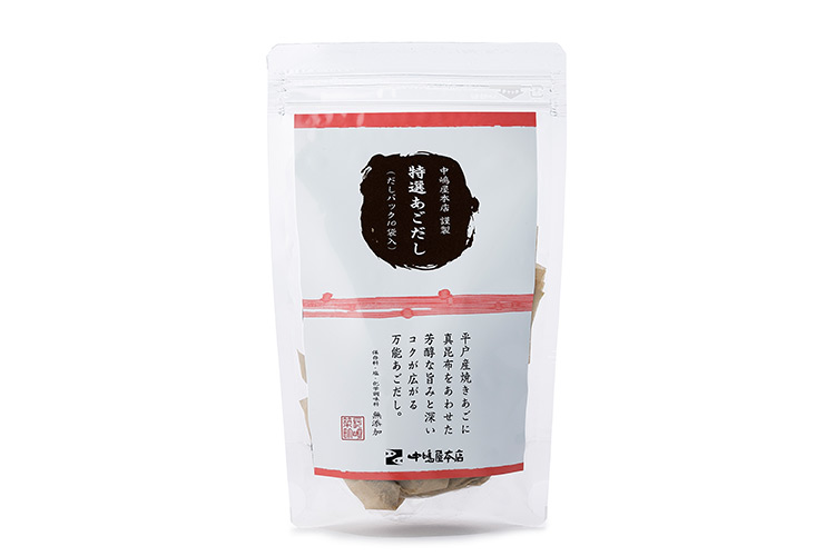あご節を軸に、旨みの違う鰹、鯖、鰯、昆布の4種をブレンド。あっさりとしつつ、異なる食材の旨みが折り重なることで、コクも感じられる味わい。他の調味料をほとんど使用しなくても、十分おいしい出汁が煮出せます。