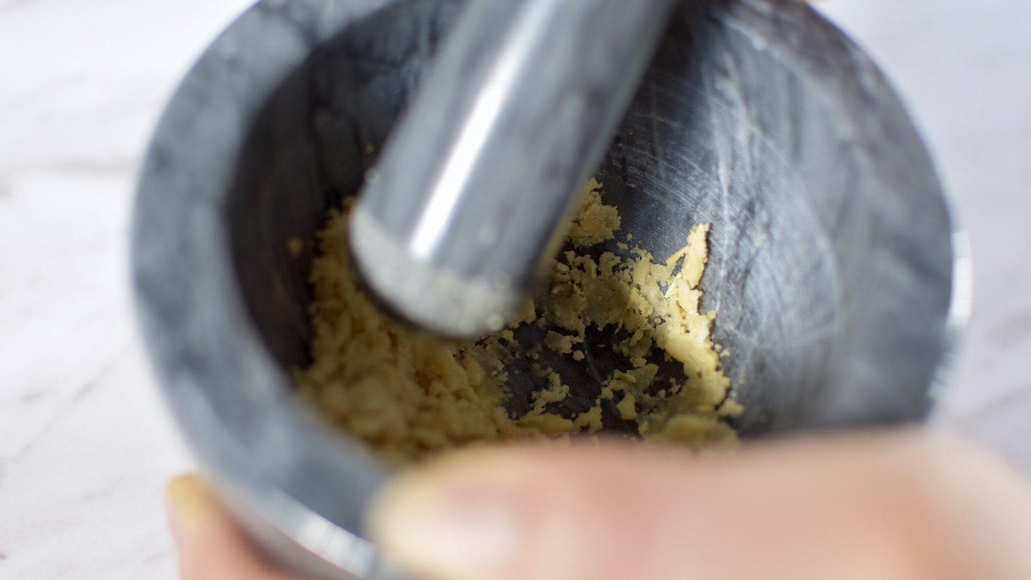 - 木や大理石などでできたイタリアのすり鉢。もちろん、日本のすり鉢でつくってもおいしく仕上がる