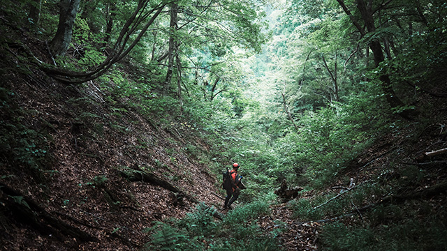 指された「ここから」が一瞬わからないくらい、当然ながら入口も道もない。木々の鬱蒼と茂る中、細い枝葉をかき分け、地すべりやぬかるみを避けながら入っていくのだ。