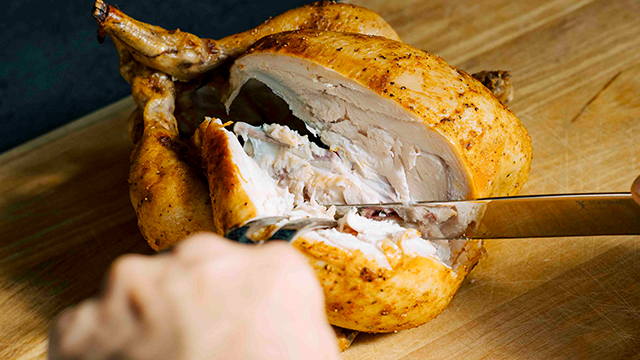 - まずは食べやすく切り分け、そのままのおいしさをシンプルに味わいましょう。どちらのローストチキンも、ひと晩マリネして焼くひと手間で、長時間焼いてもしっとりやわらか。風味をまとわせながら低温でゆっくり火を通し、最後に高温で表面を香ばしく仕上げた、上質な舌ざわりもおたのしみください。