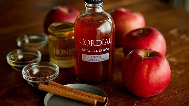 - 店舗で煮込むスパイスの効いたアップルサイダーを、いつでも手軽にたのしんでいただけるようにコーディアルシロップに仕立てました。