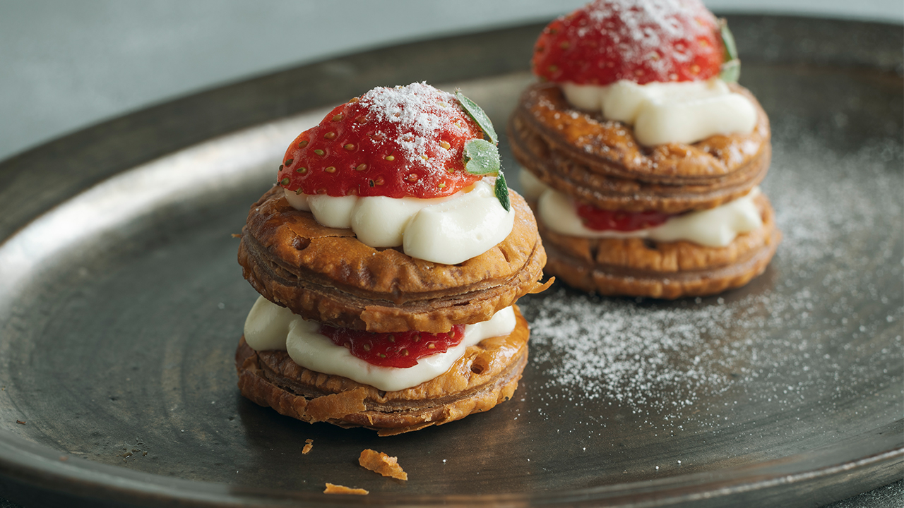この冬は、トラディショナルなナポレオンパイをオマージュしたいちごミルフィーユ仕立て。 歯ざわりのいいブリゼ生地は、このメニューのためにシェフが開発し、毎日パン工房で焼き上げています。