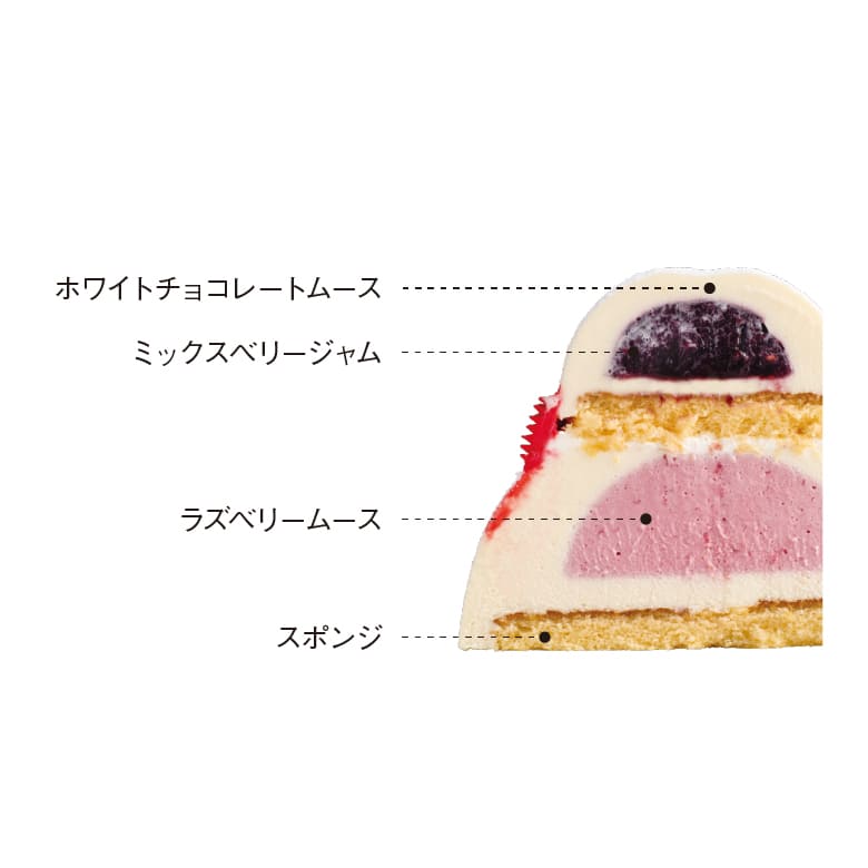 ホワイトチョコレートムースのボディーには、甘酸っぱいラズベリームースとミックスベリージャムを詰めています。やわらかく軽やかな食感で、お子さまも召しあがりやすいケーキです。