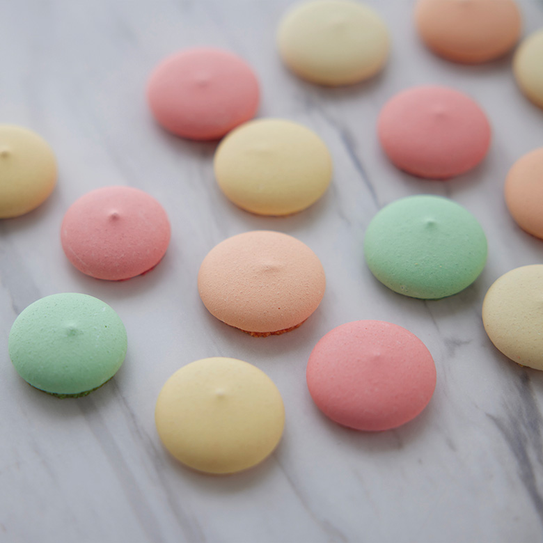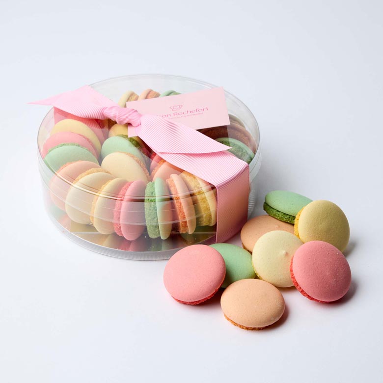 イチゴ・ピーチ・ミラベル・洋梨・青りんごの5つのフレーバーの見た目にも楽しい、マカロンラスク。
