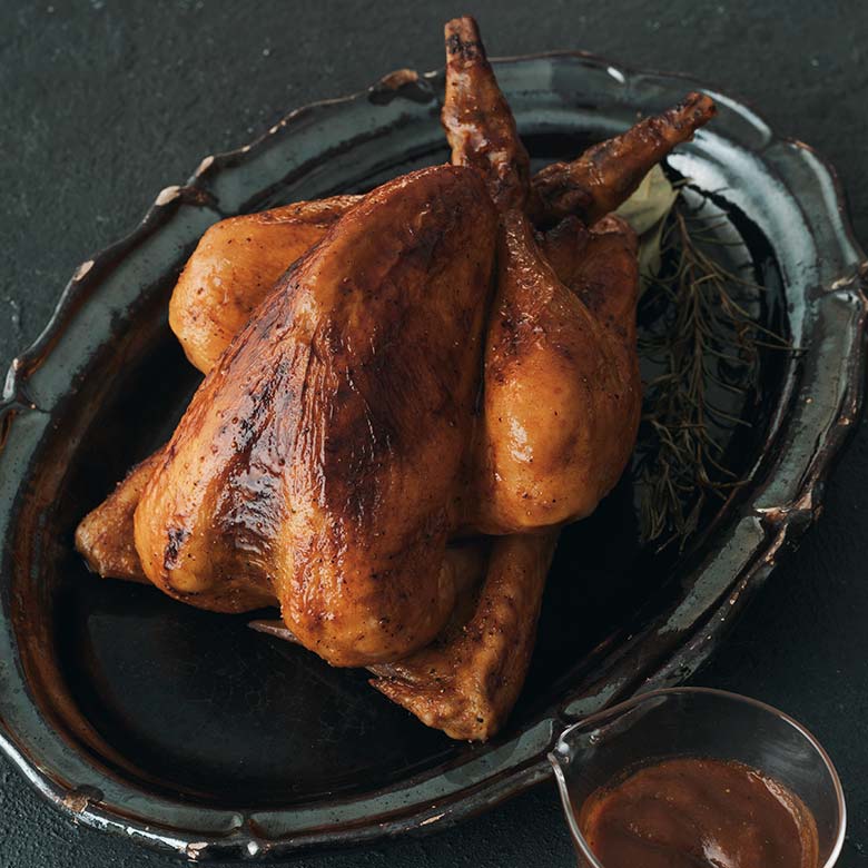 ハーブとともに下味を付け、ミックススパイス入りのグースファット(鴨脂)を塗りながら、香り高く焼きあげます。最初に低温でじっくり焼き、中はしっとりジューシーに。仕あげに高温で焼き、表面はパリッと。グレービーソース付き。