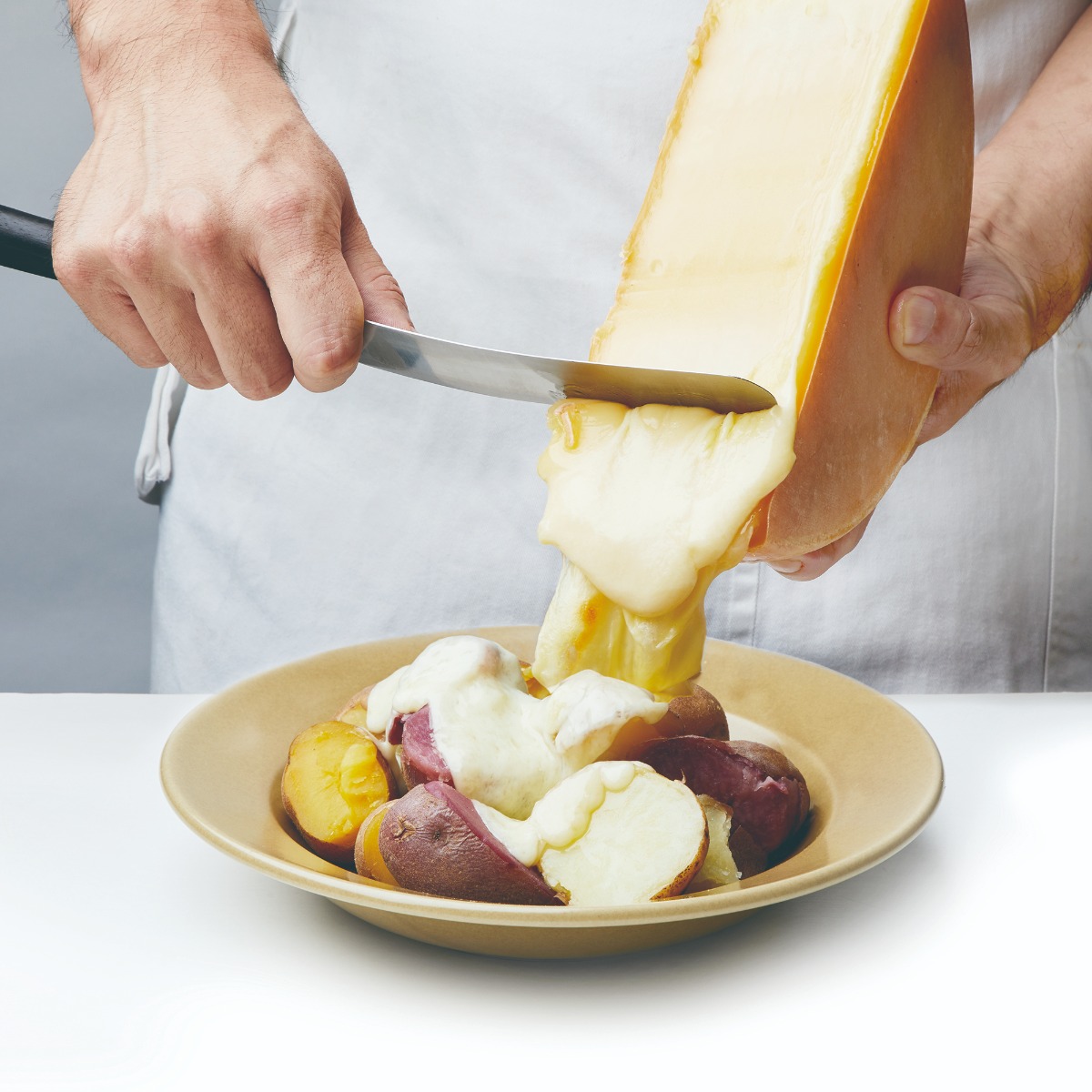 とろけるほど、風味が豊かになるチーズ「ラクレ」はフランス語で「削る」の意味。「ラクレット」とは元々郷土料理の名前で、チーズを半分に切り、断面を溶かしながら削って、パンやジャガイモにのせて食べる、アルプス地方の山小屋で食べ続けられた伝統料理。