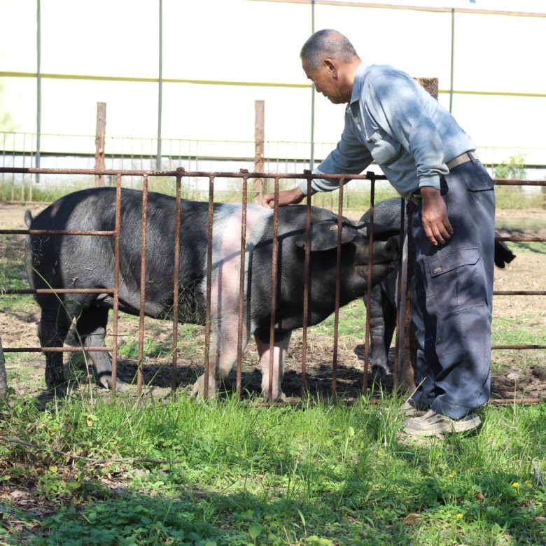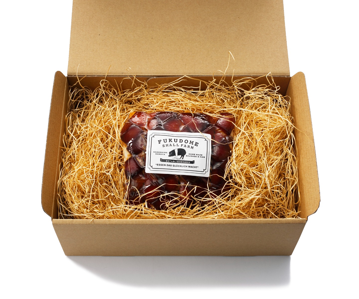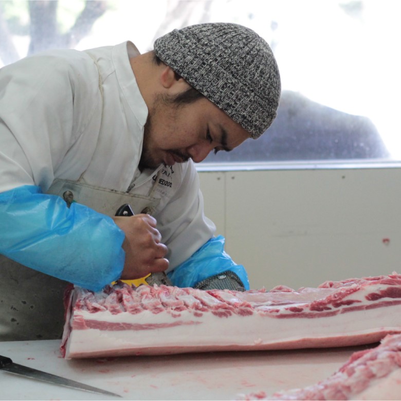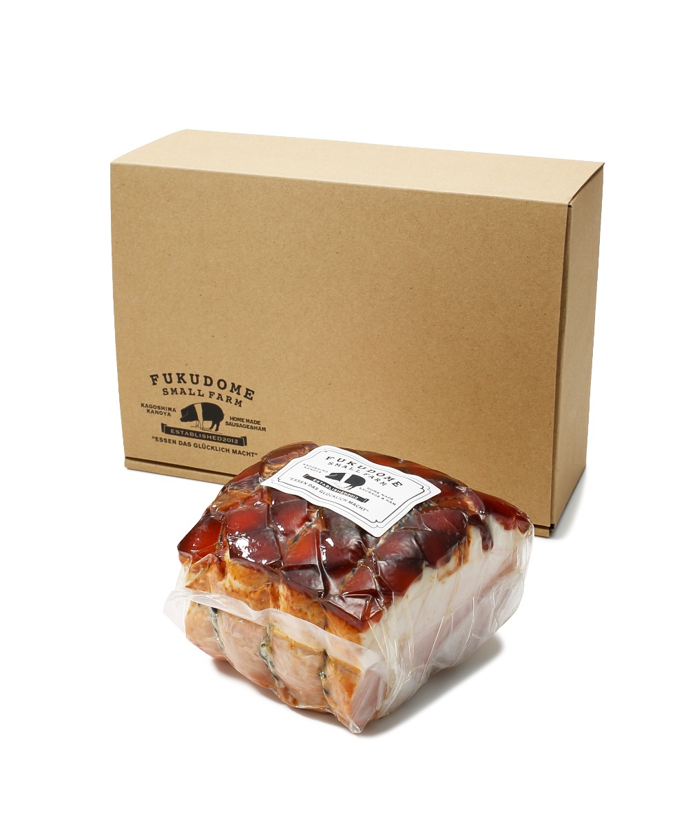 鹿児島県鹿屋市で、家族で営む『ふくどめ小牧場』。オランダで養豚を学んだ長男 俊明さんが、日本唯一の希少な豚種「サドルバック」と「幸福豚」を自社農場で育て、ドイツのビオ食肉業界を牽引する牧場『Herrmannsdorfer』で7年間ハム・ソーセージ加工の修業をし、国家資格であるマイスターを取得した次男 洋一さんがシャクータリーに仕上げています。