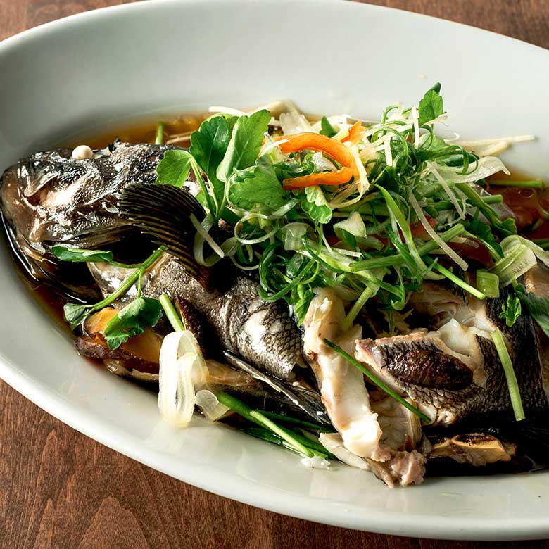 広東料理「清蒸魚(チンジャンユー)」をアレンジ。香味野菜と紹興酒で風味付けした旬の黒そいをふっくらと蒸し上げ、醤油とオイスターソース、熱々の葱油で仕上げました。