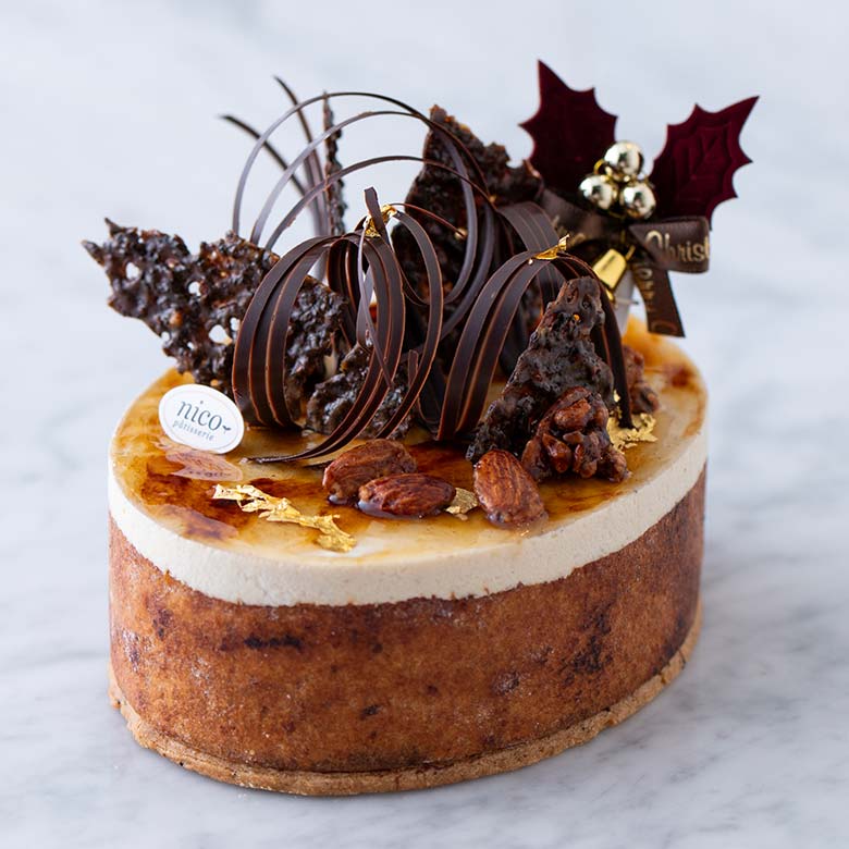 今年は、トンカ豆、コーヒー、ヘーゼルナッツと3種のムースの下に、甘じょっぱいナッツのキャラメリゼとトンカ豆のサブレを忍ばせた大人の味わい。ブランデーシロップが程よいアクセント。