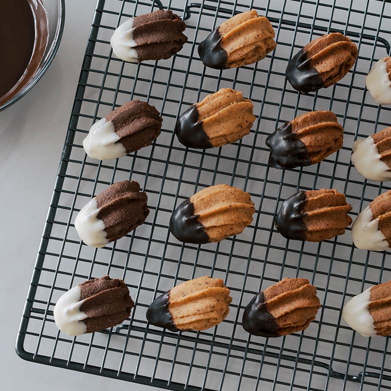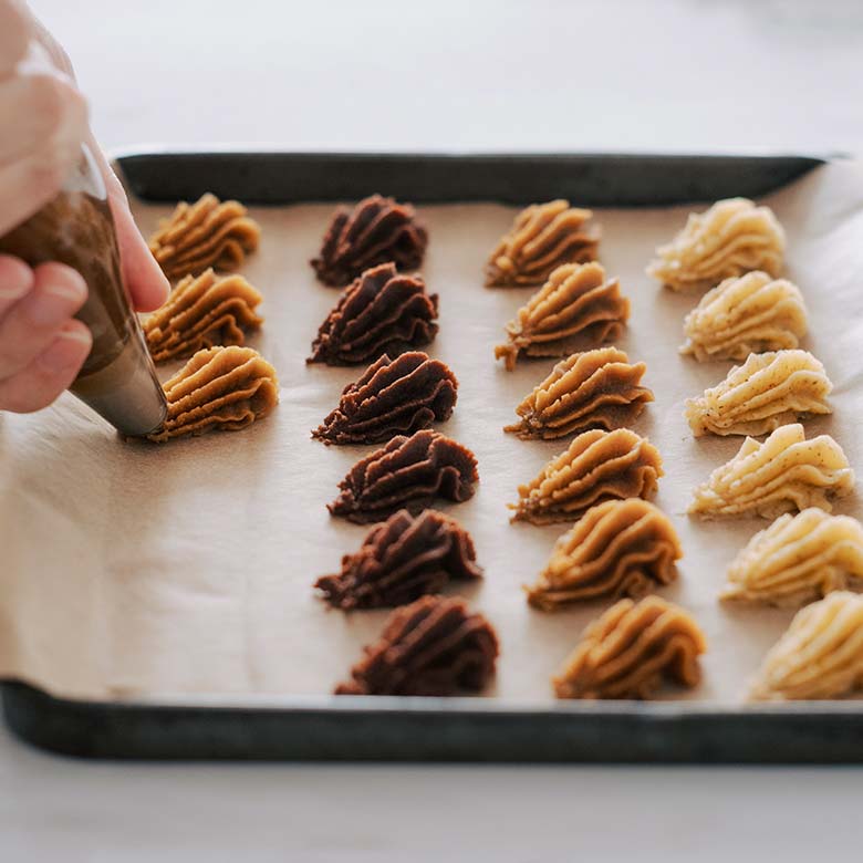 「絞り出したクッキーが好き」という福田里香さん。ベーレンタッツェンは、以前から“おいしい絞り出しクッキー”として注目していたそう。 福田里香さんとつくったベーレンタッツェンは、ドイツでもつくられるような、さっくりと口の中で崩れていく素朴な食感と繊細な味わいをめざしました。 ほろほろの生地なので食べやすい工夫として、現地より小さめの成形にしています。どちらかというと「小ぐまの手」という方が似合うかもしれません。