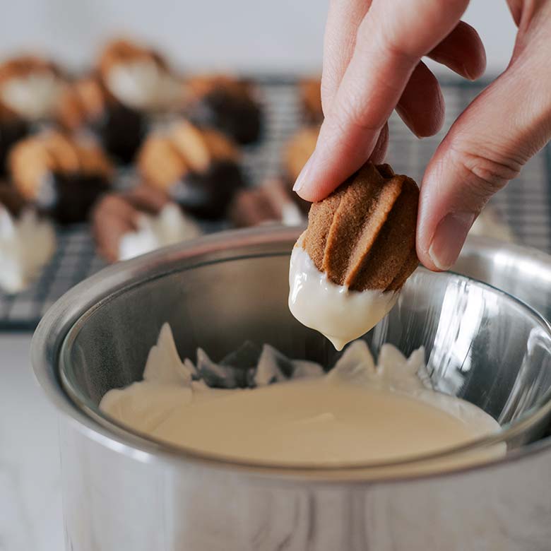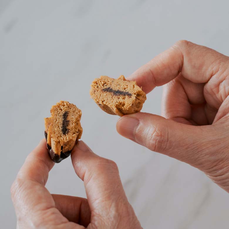 生地とチョコレートの組み合わせは4種類。それぞれ異なる味わいで、個性ゆたかなバリエーションをおたのしみいただけます。 ベーレンタッツェンはクッキー菓子ですが、チョコレート菓子としても召しあがっていただけるように、ダークとミルクのチョコレートをそれぞれの生地に贅沢にたっぷり挟み、クッキーの表面にもチョコレートを掛けました。