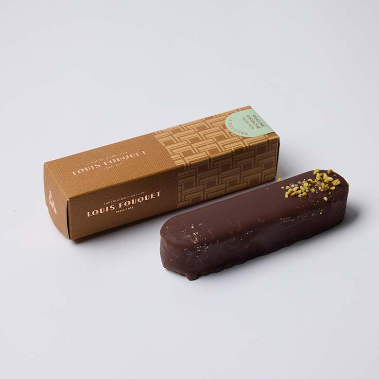 ピスタチオを贅沢に使用。ざくざく食感のプラリネを香り高いビターチョコレートで包んだブシェショコラ。