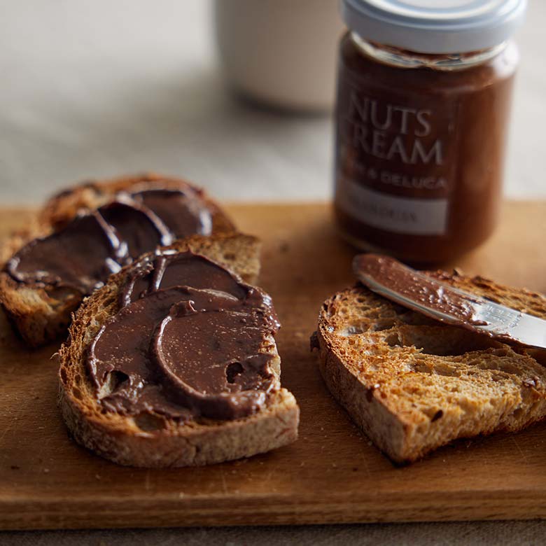 ピエモンテ産ヘーゼルナッツを使用し、甘さ控えめで、カカオ香る、舌触り滑らかなジャンドゥーヤクリームは、シンプルにパンに塗ったり、朝食にもおすすめです。