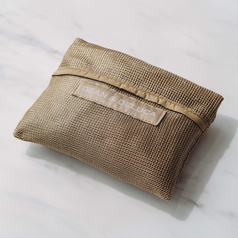 少し光沢感のある上品なベージュカラーで、どんなスタイルにも馴染みます。使わない時はバッグを折りたたんで内側のポケットに収納することができるパッカブル仕様。