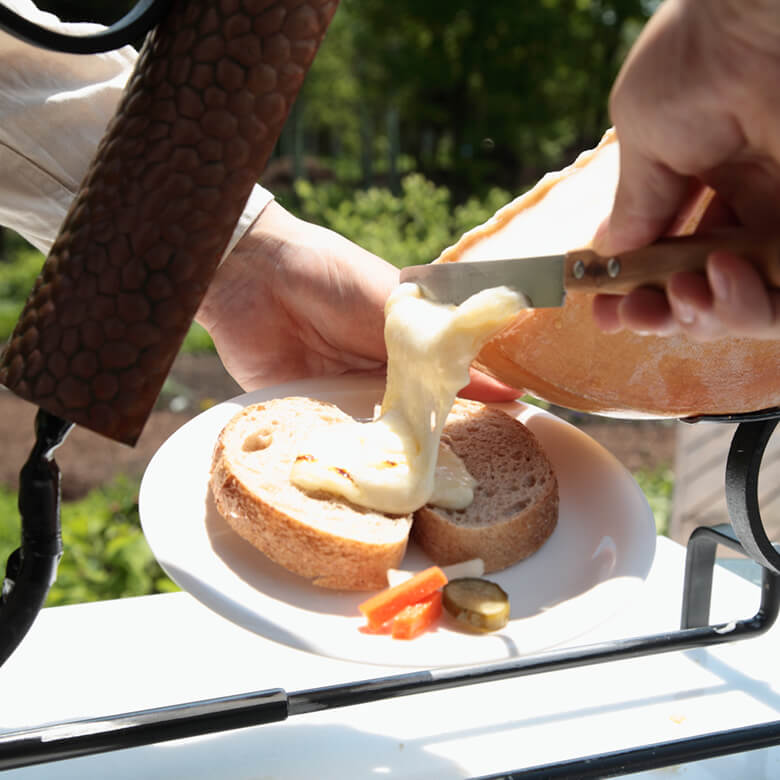 とろけるほど、風味が豊かになるチーズ「ラクレ」はフランス語で「削る」の意味。「ラクレット」とは元々郷土料理の名前で、チーズを半分に切り、断面を溶かしながら削って、パンやジャガイモにのせて食べる、アルプス地方の山小屋で食べ続けられた伝統料理。