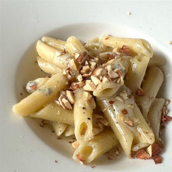 ペンネゴルゴンゾーラ:2種類のゴルゴンゾーラとパルミジャーノを使用した奥行きのあるあじわい。 アーモンドペッパーを仕上げにふりかけることで食感のアクセントが生まれます。ワインとの相性も抜群で、残ったソースをパンとおたのしみいただいても。