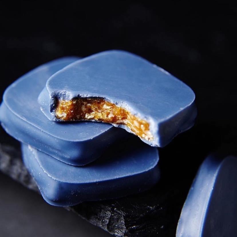 フランス・アンジェの街並みの青い屋根瓦を模した青いチョコレート。中の香ばしいヌガティンが後を引きます。