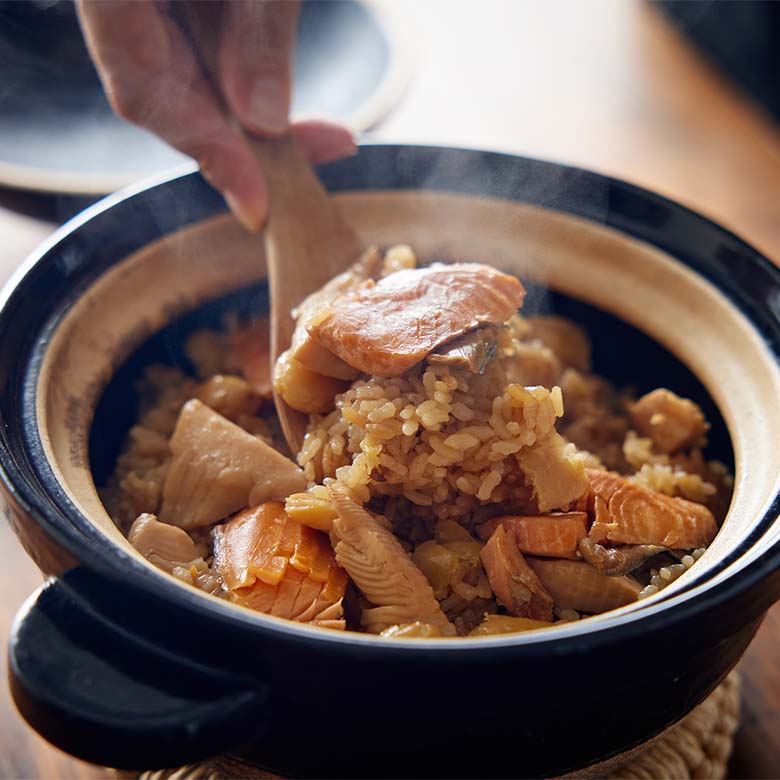 こだわりのつゆで仕あげた、三陸産銀鮭の炊き込みごはん
