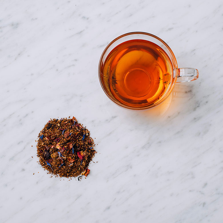 心を癒す華やかな風味のフレーバードティーです。南アフリカに伝わるルイボスティーをベースにハイビスカスやローズヒップなどのハーブをブレンドした色鮮やかなお茶。飲み口はほんのりととろみがあり、爽やかな酸味と華やかなローズの香りが心とからだを癒します。ドライフルーツなどあわせると甘みが引き立ちおすすめです。