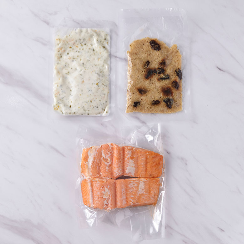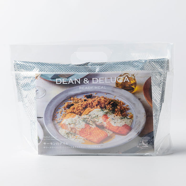 サーモンのグリル:銀鮭(チリ産)、食塩(一部にさけを含む) クスクスとレーズンのサラダ:クスクス(デュラム小麦のセモリナ)(イタリア製造)、レーズン(国内製造)、オリーブオイル、食塩、ブラックペッパー、(一部に小麦を含む) サワークリームレリッシュソース:サワークリーム(乳等を主要原料とする食品)(国内製造)、スイートディルレリッシュ(国内製造)、ゆず皮(愛媛県産)、食塩/香辛料抽出物、増粘剤(キサンタンガム)、ウコン色素、乳酸Ca、フィチン酸、(一部に乳成分を含む)