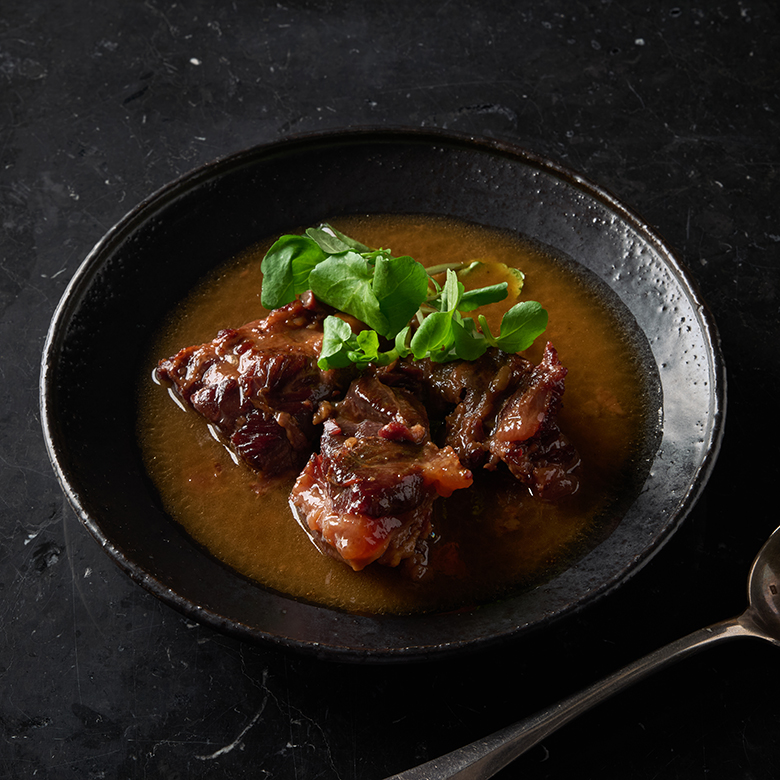 山林放牧で深い旨味と赤みを蓄えた短角牛。コラーゲン質豊富なスネ肉を香味野菜と牛骨、ゆっくり一日かけてフォンドブフ(牛出汁)と、エルブドプロヴァンスでじっくりと火入れをおこなったブラウンソース煮込み。