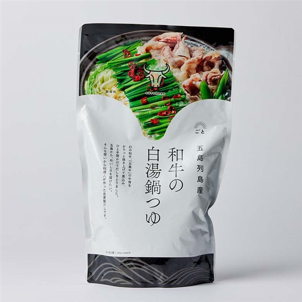 希少な「五島牛」の牛骨をオーブンでカリカリに焼き上げて、昆布とあわせて煮込んで出汁をとった白濁が特徴の白湯鍋つゆの素。ストレートタイプ。