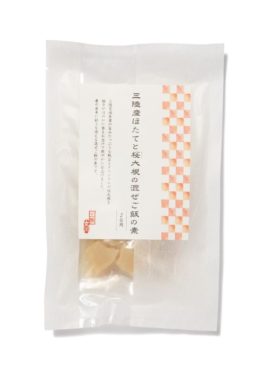 ほたての甘み、旨みに、桜がほんのり香る大根、そして桜の塩漬けも加えた、春をよろこぶ混ぜごはんの素です。