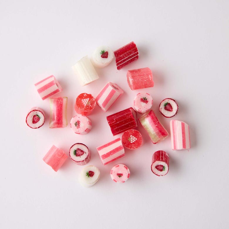 職人がひとつひとつ手作業で仕上げる見た目にも楽しいキャンディ。季節限定のいちご柄です。