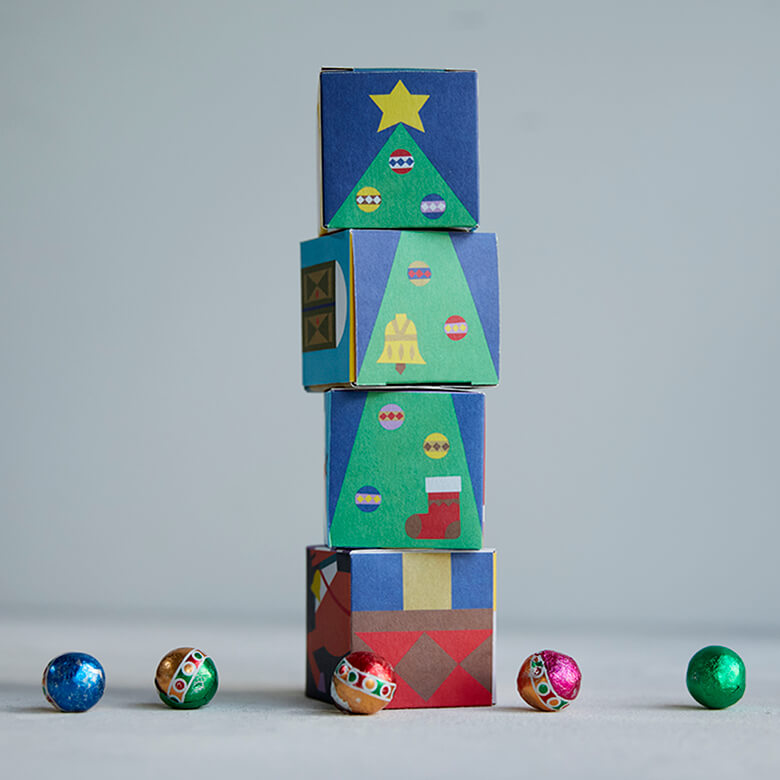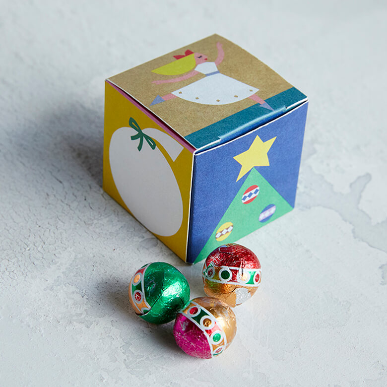 4種類の箱を組み合わせると5つの絵柄のパズルが 完成するボックス。食べた後も飾って、遊んで。
