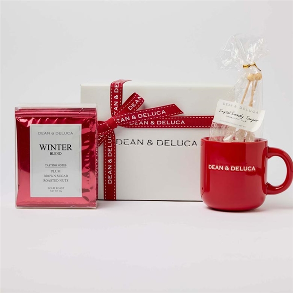 冬のコーヒータイムをたのしむギフトセット。ホリデーの季節らしく赤いリボンで仕上げました。