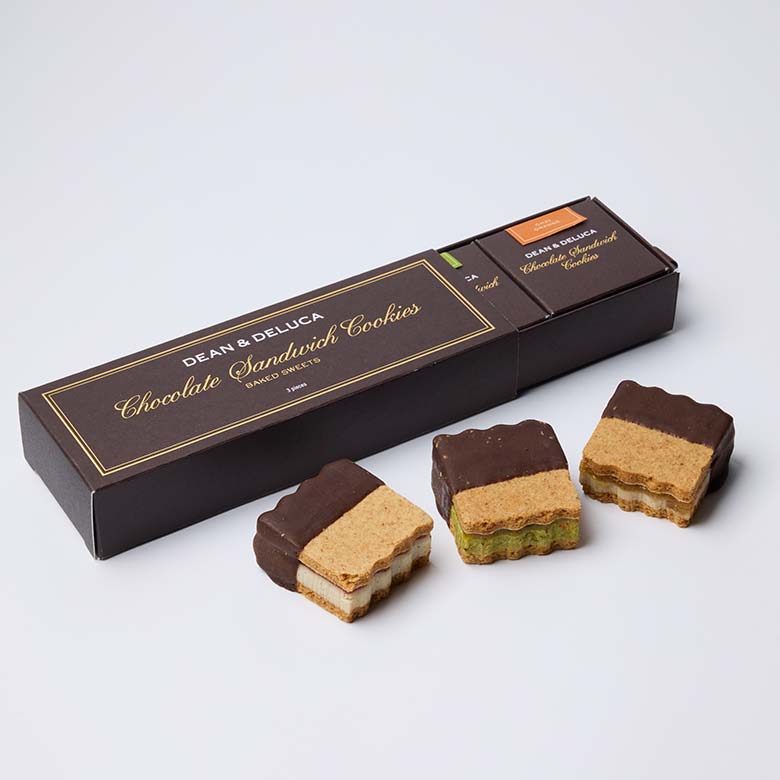 全粒粉入りのクッキーでフレーバーチョコを挟み込み、その上にオリジナルハウスチョコレートをかけた贅沢なチョコサンド