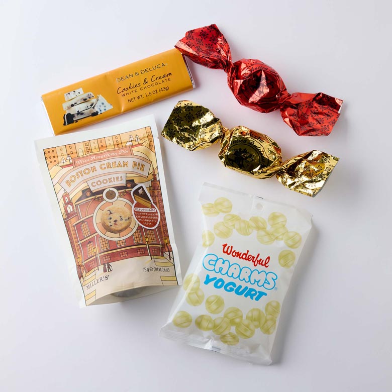 バイカラーのバックにお菓子をたっぷり詰めました。ギフトにもぴったりです。