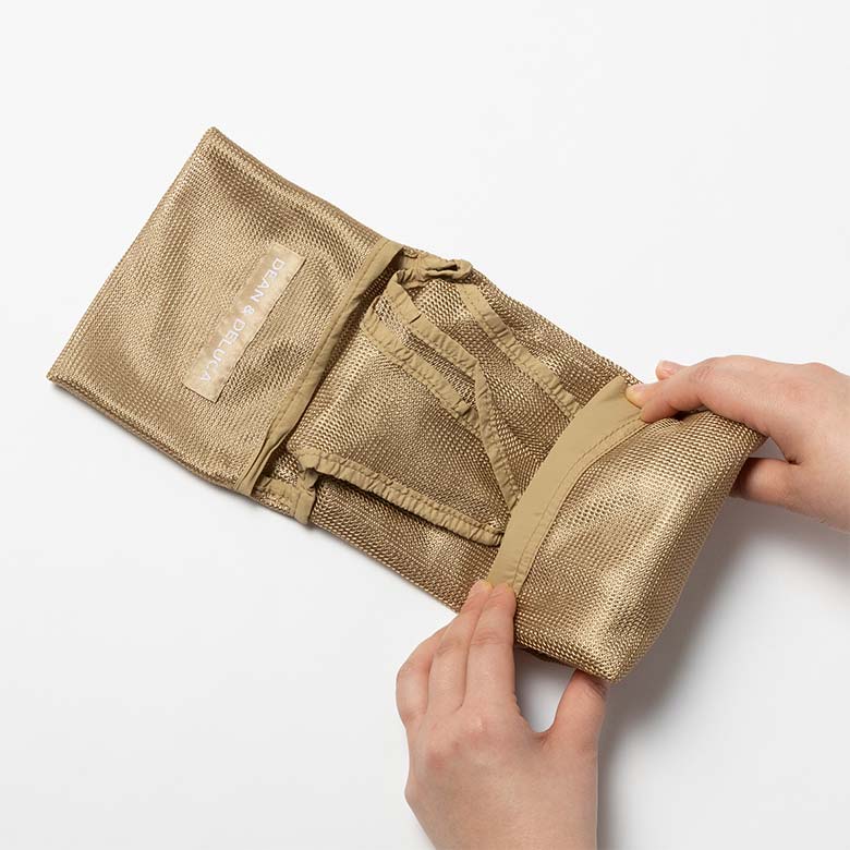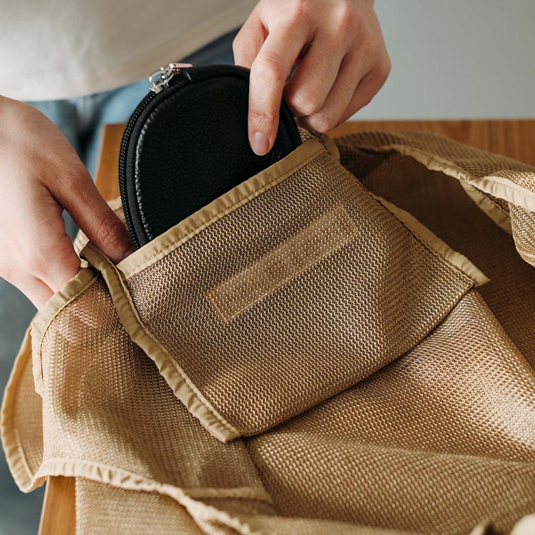 ポリエステルのネット生地は、湿度の高い梅雨や汗ばむ夏にもうれしい、さらっとした素材。底面の切り替え生地は撥水加工されたナイロンを使用しています。少し光沢感のある上品なベージュカラーで、どんなスタイルにも馴染みます。