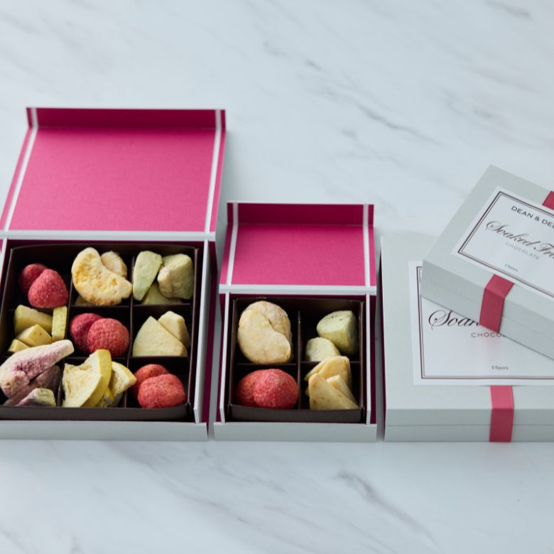 そのまま食べてもおいしい上質なフルーツを使用。生のフルーツの仕入れから、カット、チョコレートを染み込ませるまで、一貫して手作業で丁寧に作られており、見た目の美しさも光る逸品。