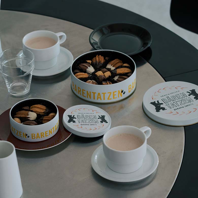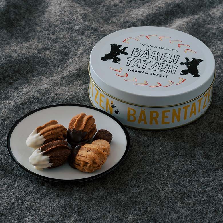 ほろりと繊細なベーレンタッツェンを大切にお届けしたいから、パッケージの体裁には「缶」を選びました。 缶の挿画を担当していただいたのは、イラストレーターの塩川いづみさん。文字や縁飾りも、すべて塩川さんの手描きのものです。「くまの手」という名のお菓子なので、手渡しで贈りものにしたくなるような、ベーレンタッツェンのイメージにぴったりのデザインに仕あがりました。 食べ終わった後は、それぞれのとっておきのものを入れて余韻に浸りたくなるように。パッケージの細部まで、福田里香さんの想いが込められています。
