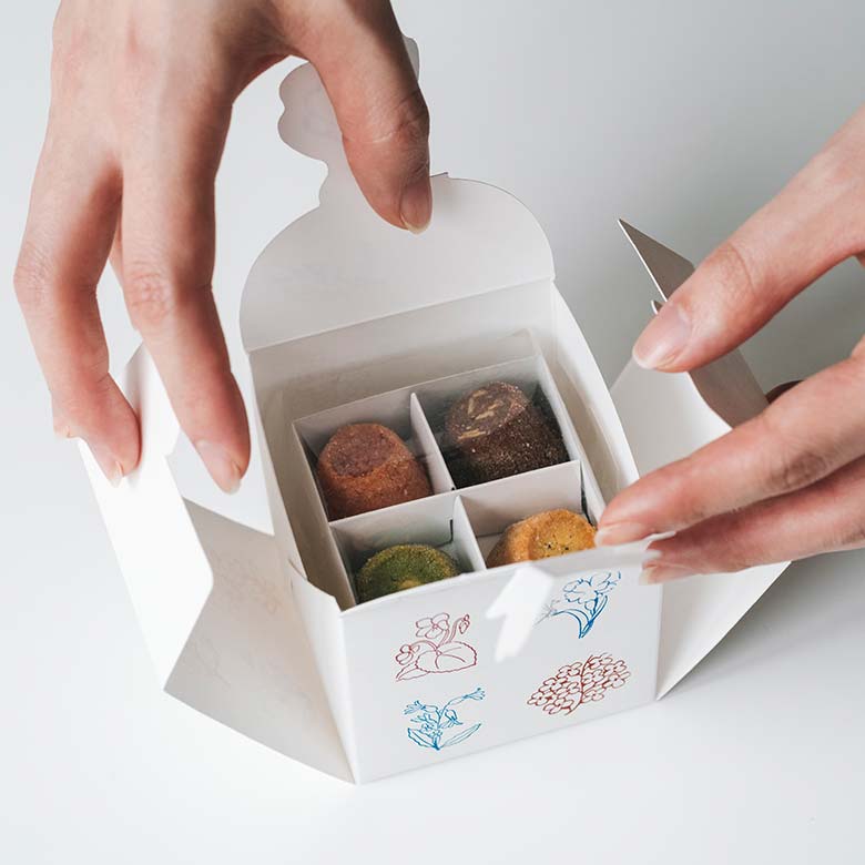 味わい・香り・色が異なる4種のフレーバーに、それぞれ相性のよい素材を掛け合わせました。サクッと頬張った瞬間から後味まで、刻々と味わいが変化。ひとつで2つの食材のハーモニーが広がります。 一粒の満足感はありながらも、ひと口サイズだから、一度のティータイムでいろいろな味をお試しいただけます。