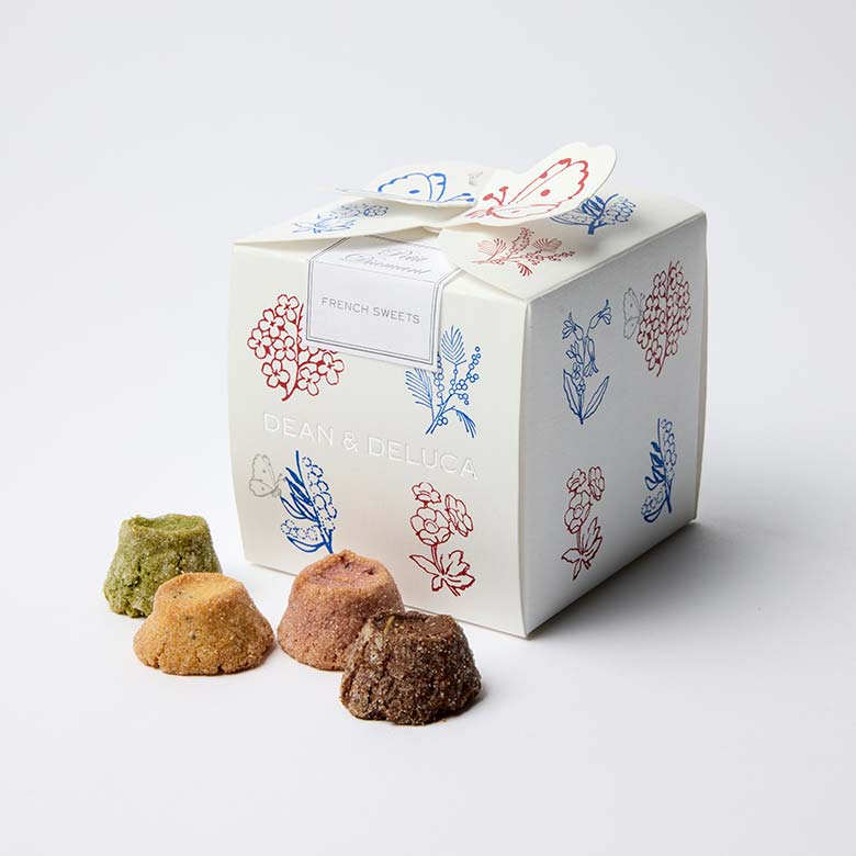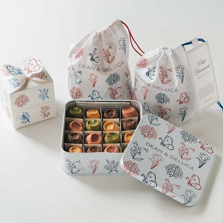 「贈りもの」としても喜ばれるお菓子は、目に映る姿も大切です。受け取った方が、思わず微笑んだり、小さく歓声をあげてしまうような、心ときめく姿。「プティ・ディアマン」は、トリコロールカラーのシンプルな缶に、蚤の市で見つけたようなスタンプ模様をデザイン。スタンプのモチーフは、フランスの庭園で揺れるミモザやキンポウゲ、ひらひら舞う蝶々など、春を告げる自然です。食べ終わった後も、それぞれの大切なものを入れて余韻に浸りたくなる。そんな宝石箱を目指しました。