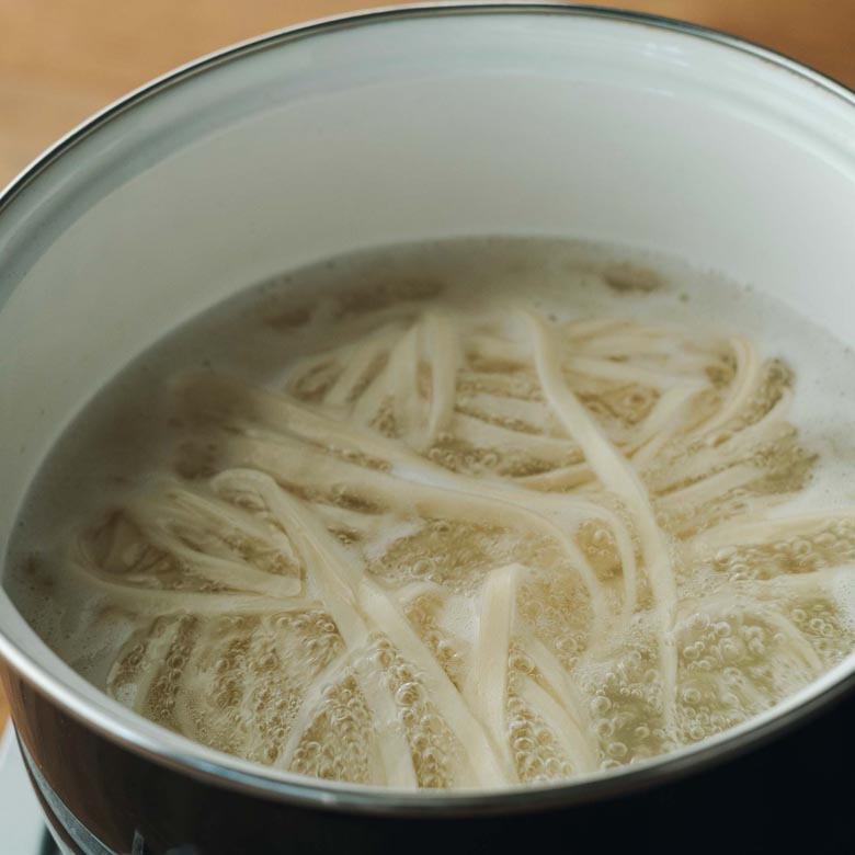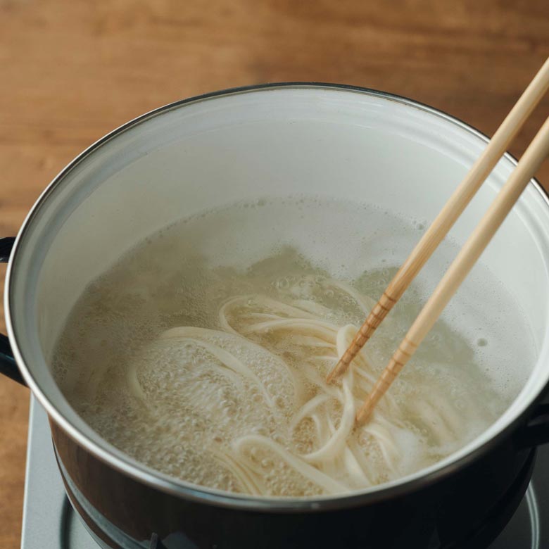 ①麺を茹でる。沸騰したお湯に、適当な長さ(3~4切れ)に切った麺を入れ、箸で軽くほぐしながらゆでる。(約4分)
