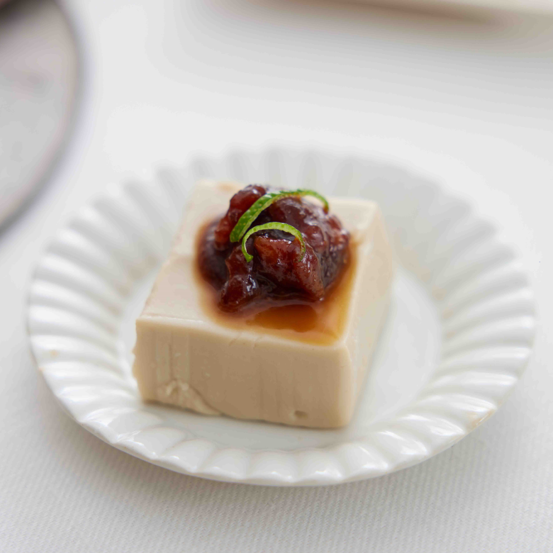 もっちり、ぷるんとした食感に、ごまの豊かな風味が広がる胡麻豆腐。そのたれに『佃の佃煮』の「くるみ味噌」を使いました。
