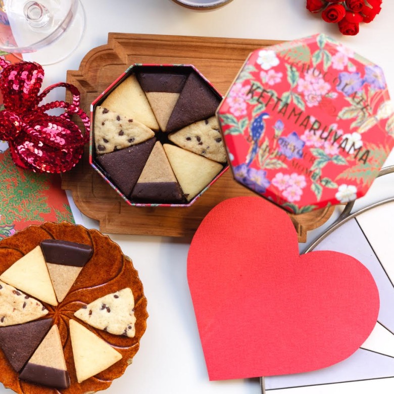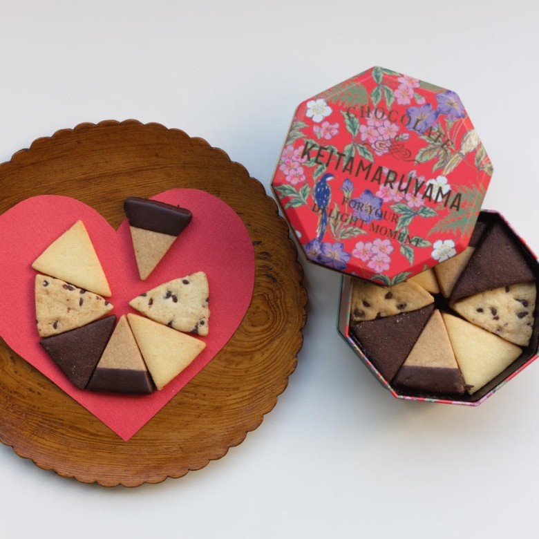ケイタマルヤマらしい華やかな花鳥柄をあしらったクッキー缶。三角型に焼き上げた5種類のクッキーを美しく詰め合わせました